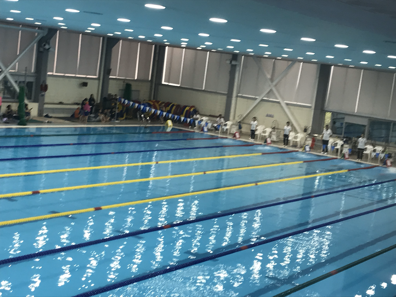 첫 대회에서 50미터를 처음으로 가 보는 내 아이는 라인의 길이에 놀라고