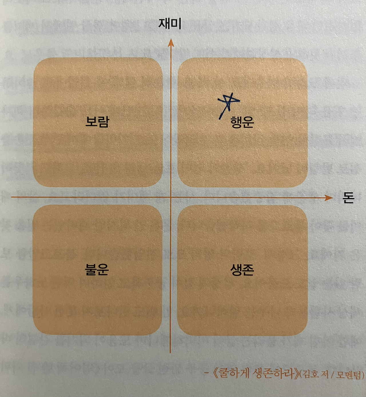 일에 관해 돈과 재미로 구획지은 사분면이 있다. 많은 사람들은 재미는 없지만 돈 때문에 일을 하는 ‘생존’의 영역에 머물고 있을 것이다. 현역시절 나는 어떠했을까? 운 좋게도 돈도 벌었지만 재미도 있었던 일이었다. 드물게 행운의 영역에서 일을 했던 사람인 셈이다. 그리고 은퇴를 맞이했다. 50대 은퇴자는 돈을 많이 버는 일자리는 더 이상 구하기가 어렵다. 그렇다면 일자리 전략은 두 가지 중 하나이다.