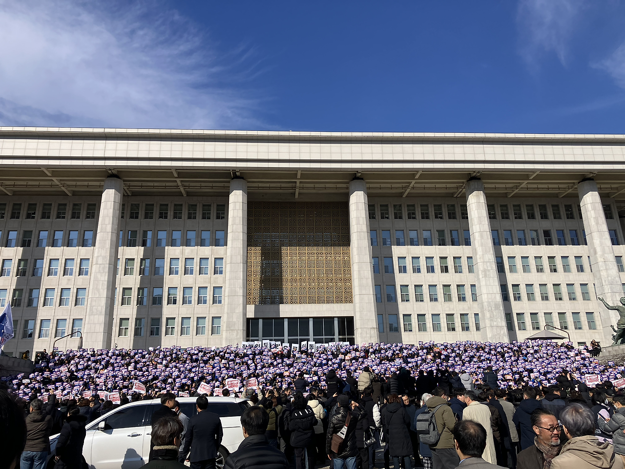 오전에 여의도 국회의사당을 다녀왔다. 지난밤에 있었던 긴장감은 온데간데 없고 의사당 계단에는 민주 당원들의 윤석열 퇴진 집회가 열리고 있었다. 점심시간이 다가오자 여의도 근처 직장을 둔 사람들과 지하철로 넘어온 사람들이 속속 모여들었다. 식전 행사로 국기에 대한 경례와 애국가 제창을 하는데 나도 모르게 울컥 눈물이 난다. 민주주의는 정말 유리알 같은 제도라는 걸 다시금 실감하는 시간이었다. 어떻게 이 나라는 제대로 된 머슴 하나 뽑기가 이리도 힘들까 싶어 한숨이 절로 난다. 그나마 어젯밤 일은 정말 다행이다.