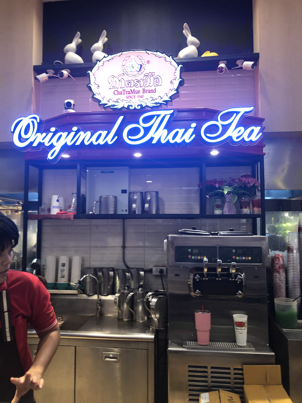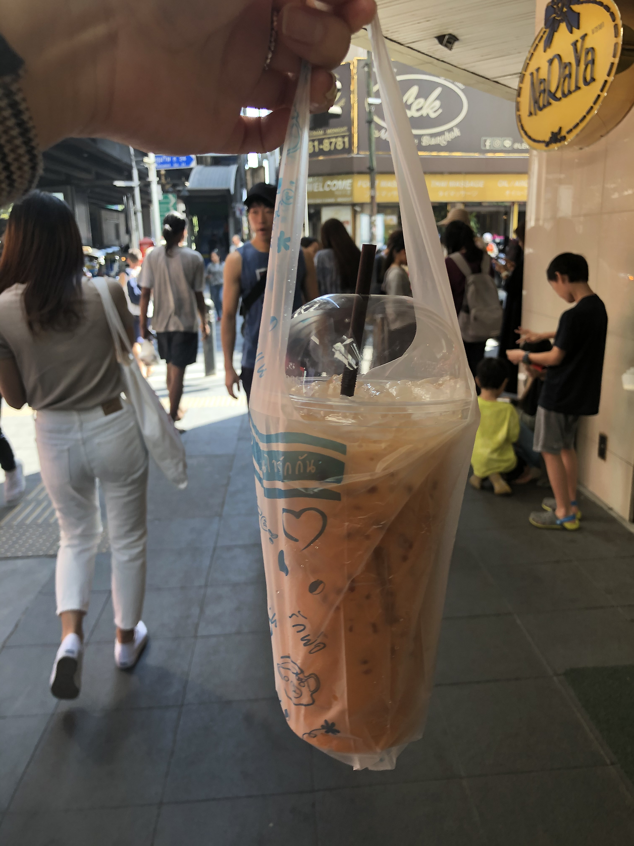 친구 약속이 있어 엠포리움으로 향하는데, 사람들이 하나같이 길거리에서 태국 차이 라테를 시켜서 나도 한번 사 먹어봤다. 20밧에 연유 그득 넣고 설탕에 우유 한가득 넣어서 얼음에 주는 건데 진짜 달면서 맛있었다. 800원인데 나쁘지 않았다. 그리고 카페인이 들어간 건 절대 안 먹어야지 했다가 이건 좀 특이하고 맛있는 맛일 것 같아서, 몰 안에 들어가서 파우더를 사 왔다. 음료도 하나 시켰는데 연달아서 음료를 두 개 먹었더니 당이 올라서 중간에 몇 입 먹다가 도저히 못 먹고 버렸다. 한국에서 사 왔는데, 연유를 넣지 않고 우유 대신 물을 넣어서 그런지 그때의 그 감동적인 맛은 아니었다.