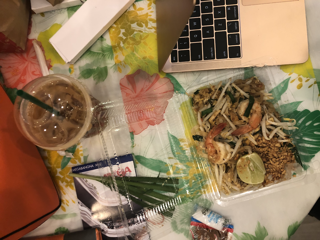 스타벅스를 갔는데 하나 사면 하나를 공짜로 어떠한 음료든 제공하는 날이었다. 오후 6시쯤 1일 1식을 하러 밥 한 끼 먹고 커피 한잔 테이크 아웃하려고 하다가 괜한 사치로 디카페인 커피 두 잔을 가지고 왔다. 길거리에서 그냥 아무 팟타이도 맛있겠지 하고 주문했는데 더럽게 맛없었던 팟타이였다. 카페에서 후식으로 빵을 사 왔는데 빵을 안 사 왔으면 정말 강제 단식할 뻔했던 식사였다. 원래는 5시까지 기다력서 팁싸마이를 딜리버리 하려고 했었는데 아무리 어플을 깔아도 보이지 않는 것이었다. 알고 봤더니 우리 에어비앤비가 너무 팁싸마이에서 멀어서 뜨지 않는 것이었다.