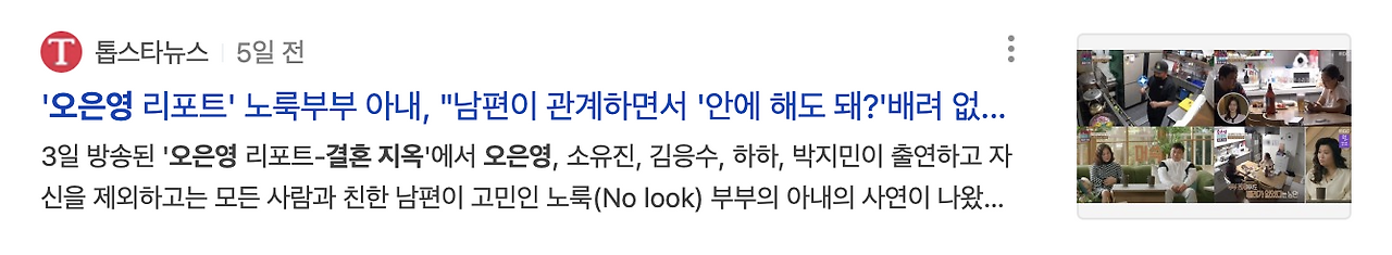 지상파에서도 부부심리상담을 주제로 이런 이야기들이 기사화되면 포털 사이트 한 가운데에 뜬다. 아무리 자극적인 기사를 뽑는 거지만 정말 저런 상담 내용들은 그렇게 본인들이 그렇게 심각하게 고민이면 돈을 주고 사람들 모르게 상담을 받아서 해결했으면 한다. 방송국에서 이런 이야기들을 부부의 문제 해결이 아니라 개인의 몰라도 될 권리에 대해서 얼마나 심의하고 생각했는지 의문이 들 정도다. 구혜선이 이혼전쟁을 선포할때 두 사람이 온 국민들에게 나눠준 tmi들은 정말 잊고 싶은데 아무리 시간이 지나고 새로운 주제와 이야깃거리로 화면에 비춰지지만 이젠 두 사람 모두 얼굴만 보면 떠오르게 하는 것과 다를바가 없다.