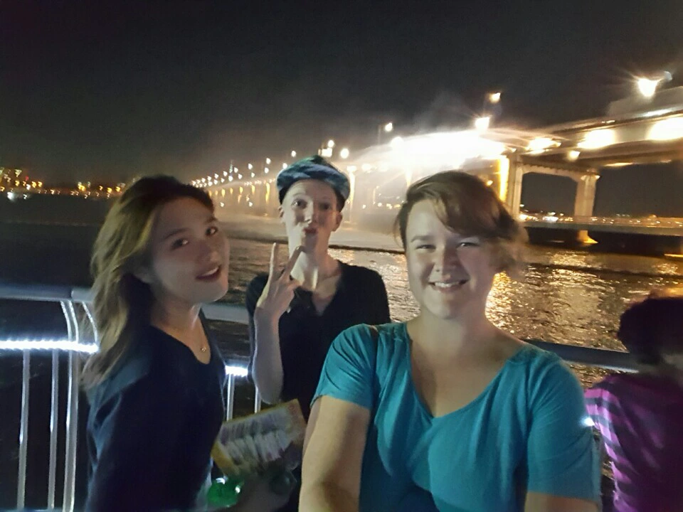 물이 엄청 튀기는 하지만 그래도 마냥 아름답고 좋은 반포대교 레인보우 분수였다. 이날은 대교 사정으로 인해 분수가 나오는 방향이 반대로 바뀌었다. 배경음악은 sg 워너비라 또 내가 제일 좋아하는 가수라고 방방뛰었다. 내게있어 sg워너비는 참 특별한 존재다. 2집때부터 앨범을 모으기 시작해서 채동하가 죽은 후론 자연스레 관심이 끊겼다. 보컬 김진호를 가장 좋아했던 이유는 노래 실력이 가장 뛰어남에도 불구하고 늘 가운데 자리를 차지 하지 않고 사이드에서 노래를 부르는 안타까움이 있었다. 그렇게 이석훈이 멤버로 보강되고 김진호는 늘 응원하지만 더이상은 sg워너비 앨범은 사지 않는 그 열정과 관심이 아지아틱스로 옮겨갔었다. 하지만 얼마전에 그들도 해체...(OTL)