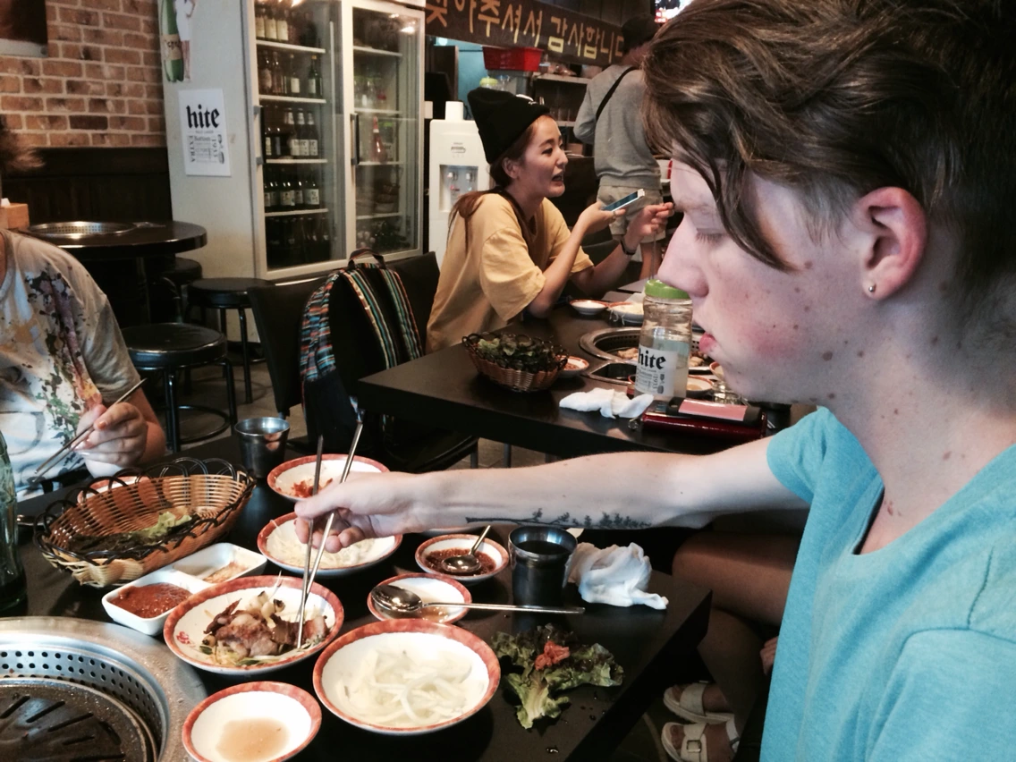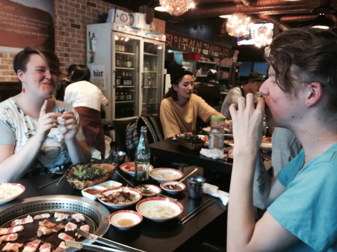 코리안 바베큐, 베이컨이 먹고 싶다며 노래를 불렀다. 아가리 다이어터로써의 임무를 저버리고 오후까진 열심히 식이에 성공했다. 이날도 마찬가지였다. 어딜가나 고기를 잘 굽지 못한다며, 혹은 구웠는데 탈까봐 걱정된다며 손을 놓고 있는 재수없는 역할 담당이었는데 이 날은 나보다 더 고기를 못굽는게 당연한 난생처음 불판을 보는 아이들앞에서 자연스럽게 고기굽는 것이 내 담당이 되었다. 앨리샤는 내게 고맙다는 인사보다 "쑤가 짱이야.네가 최고야."라는 말을 한다. 힘든 와중에도 그 말 하나가, 립서비스일지도 모르는 그 메세지하나가 어깨를 으쓱거리게 하는 내 자신을 발견하며 나도 칭찬에 약한 남성성을 가지고 있는건가? 고개를 갸웃거렸다. (남자도 그렇지만 여자도 칭찬에 약하답니다!)