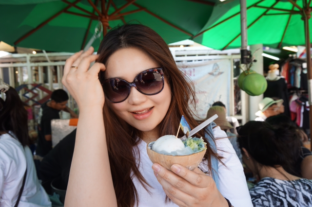 어쩌다 얻어걸린 코코넛 아이스크림, 여기서 이걸 꼭 먹어보고 싶었는데 작게 들어간 코코넛밥도 망고밥이 어떤 맛일지 유추가 되는 맛이었다. 지난 번보단 더 많은 것을 보고 친구는 코코넛만 40개를 사왔다. 그리고 똑같은 코코넛을 방콕 짜뚜짝에서 650원쯤 10개에 200밧에 사왔는데 강남 뉴코아에 있는 킴스클럽에서 800원쯤 하는 걸 발견했다. 나도 덩달아 10개 사왔는데 거기서 깎으면 180밧까지 깎을 수 있었다. 하지만 들고다니고 무겁고 그냥 코코넛이 먹고 싶으면 배달되는 한국에서 사는 걸로~! 이럴때 인생무상을 느낀다. 하하하