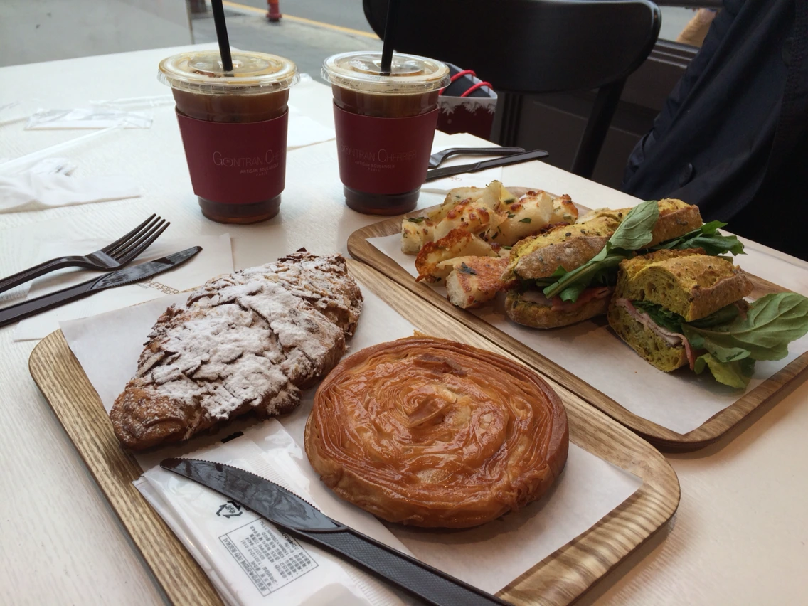 온 집안이 빵을 만든다는, 정확히 3대에 걸쳐 빵을 만든다는 파리에서 온 곤트란 쉐리에 빵집을 찾았다. 샌드위치도 자극적이지 않았고 맛있는 달콤함을 가득 채워넣은 디저트도 좋았다. 이곳의 커피도 좋아한다. 서래마을에 갈 때마다 들리곤하지만 이곳의 시그니쳐빵이나 크로와상종류는 왜 이 곤트란 쉐리에가 자꾸 지점을 늘려갈 수 있는지 이유를 충분히 설명케한다. 요즘 쉐프들이 많이 나왔다는 미국 3대 요리학교 CIA에서 먹어 본 크로와상의 형태와 맛과 꽤 비슷했다. 그만큼 정석이었고 한 겹, 한 겹 바삭거리는 식감이 바삭거리면서 뚜둑 뚜둑 끊어지는 게 좋았다. 곤트란쉐리에선 치즈가 들어있는 빵들의 풍미가 오래 기억에 남는다.