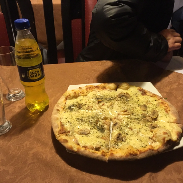 짐을 좀 풀고 한 숨 자고 나서 다음날 마추픽추로 향하는 버스표를 끊으러 갔다. 여권을 들고 가지 않아서 여권 사본을 보여드리고 겨우 끊었는데 내 국적은 일본, 내 나이는 25살 엄마 나이는 50살로 임의 지정해주셨다. 그리고 출출한 배를 달래기 위해 주위에 북적거리는 화덕 피자집을 찾았다. 막 구운 피자야 뭔들 맛이 없겠냐만은 이리도 열악한 인프라에서 치즈와 빵을 먹을 수 있다는 사실에 감사한 한 끼였다. 라스베이거스 코카콜라 매장에서 먹어봤지만 남미에 왔으면 잉카 콜라를 마셔봐야겠단 사명감에 시켰다. 인공 첨가물이 가득 들어간 향에 잉카 콜라는 친해지기 어려운 음료였다. 그리고 내일을 위한 바나나와 사과 그리고 물을 좀 사두었다.