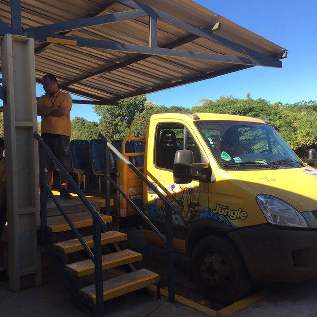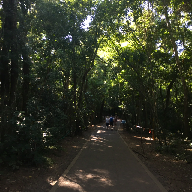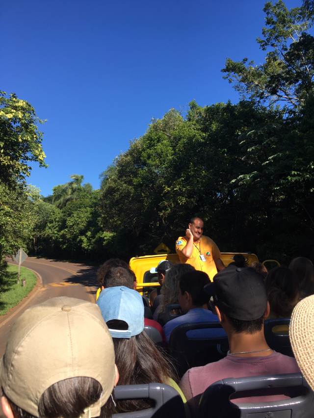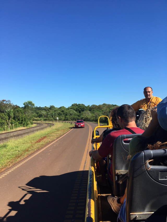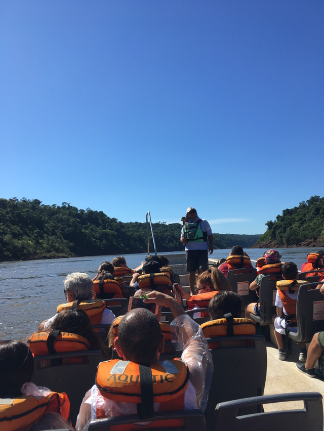 그렇게 아저씨가 알려준대로 걷고 걸어 보트투어를 하는 정류장에 무사히 도착했다. 길이 많아 자칫 잘못하면 길을 잃으면 이 첩첩산중에서 큰일 날 것 같지만 선발대로 출발해 비슷한 동선으로 가는 외국인들과 함께 표지판을 살피며 무시하 도착했다. 그리고 맨 뒷자리에서 푸른 하늘과 이과수 국립공원 정글 한 가운데에서 선선하게 불어오는 자연의 바람을 느낄 수 있었다. 틈틈히 해설가 아저씨의 자본주의적 미소와 농담이 오갔지만 뻥뚫린 공간에서 이과수폭포를 만나러 가는 길이 마냥 설레기만했다.