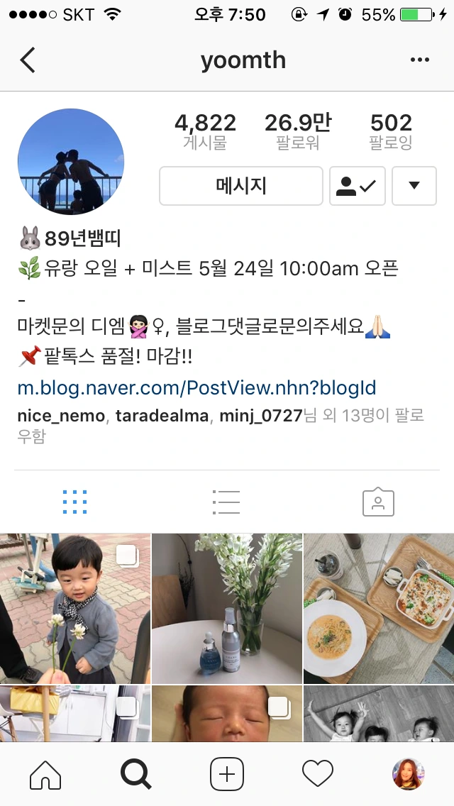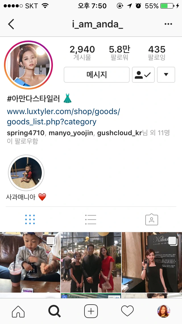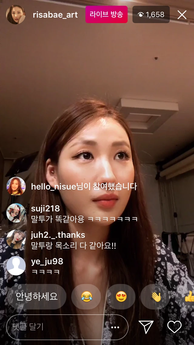 11am이라는 온라인 쇼핑몰의 모델이자 한 아이의 엄마인 윰님은 워킹맘으로써의 자신의 이야기를 솔직하게 표현한다. 내 눈에만 예쁜 아이의 모습을 넘어 다른 이들에게도 내 아이의 예쁜 모습을 공유하고 엄마로써의 삶, 그리고 아내로써의 삶을 그녀의 방식으로 풀어나간다. 때론 쿨하면서 또 때론 다정다감한 마음씨를 가진 무엇보다 그녀의 키와 몸무게공개부터 팔로워들의 다이어트 고민을 자신의 일처럼 들어주고 자신의 다이어트 이야기를 함께 전한다. 그녀는 인터넷에서 만나는, 그래서 누구나 마음의 문을 활짝 열수 있는 "마음씨까지 예쁜 언니"의 모습을 보여주고 있다. 그녀의 남편과 오랫동안 연애를 한 이야기에서부터 자신의 일상을 공유하는데 스스럼없이 털털한 그녀는 모델로써 한없이 러블리하고 프로페셔널하다. 아프리카 생방송을 한번도 참여하지 않은 사람들일지라도 인스타가 주는 심리적 진입장벽이 낮아 손쉽게 인스타그램 라이브 방송을 켜고 지나간 방송을 보고 또 그 방송에 참여하는 재미가 있다. 인스타그램 스토리는 자신이 폴더를 만들어 일종의 회고록처럼 켜켜이 쌓아가며 만들어가는 재미를 선사한다면 스냅챗은 24시간내에 사라지고 그 대화엔 캡쳐조차 상대를 알게 하기에 모든 컨텐츠와 대화까지 더 과감해지고 망가짐도 부담없이 즐길 수 있다. 아이가 커가는 모습들을 함께 지켜보는 랜선이모들의 열열한 지지속에 그녀의 팔로워수대비 라이브방송의 시청자수는 굉장히 높게 집게된다.