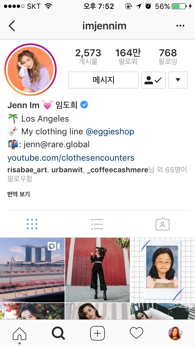 나를 YouTube 의 세계로 이끌어낸 장본인이다. 한참 내가 선택한 결정이긴 했지만 강제귀국이라는 생각을 지울 수 없을 때 미친듯이 Clothesencounter(이제는 JennIm으로 유투브 채널 이름을 변경하였다.)의 채널을 보았다. 50만때부터 함께했고 그녀는 현재 2백만의 팔로워를 거느리고 있는 Asian American 뷰티 유투버를 대표하고 있다. 늘 밝고 러블리한 그녀는 아주 보통의 키에 너무 깡마르지 않은 몸매, 그리고 금손이라 생각할만큼 크게 금손도 아니고 패셔니스타라 생각할만큼 그리 패션에 일가견이 있는 것 같지는 않지만 그래도 그녀의 뷰티 컨텐츠를 소구한다. 그녀의 컨텐츠에는 힘이 있다. 브이로그를 표방하는 채널은 아니지만 그녀의 브이로그를 가장 좋아한다. 브이로거가 아니기에 그녀의 브이로그 속에 있는 뷰티 이야기들을 듣고 있을때 거부감없이 그녀의 삶을 소구할 수 있다. 그런 관점에 있어서 그녀는 크게 망가지거나 자극적인 컨텐츠들을 생산하지 않지만 예쁜척한다고 욕을 먹지도 않는, 자기 브랜딩의 귀재라고 명명할 수 있다. 아주 보통의 뷰티 유투버들이 꿈꾸는 화려한 삶을 그녀는 충분히 현명한 방식으로 누리고 있고, 이를 즐기고 있다.
