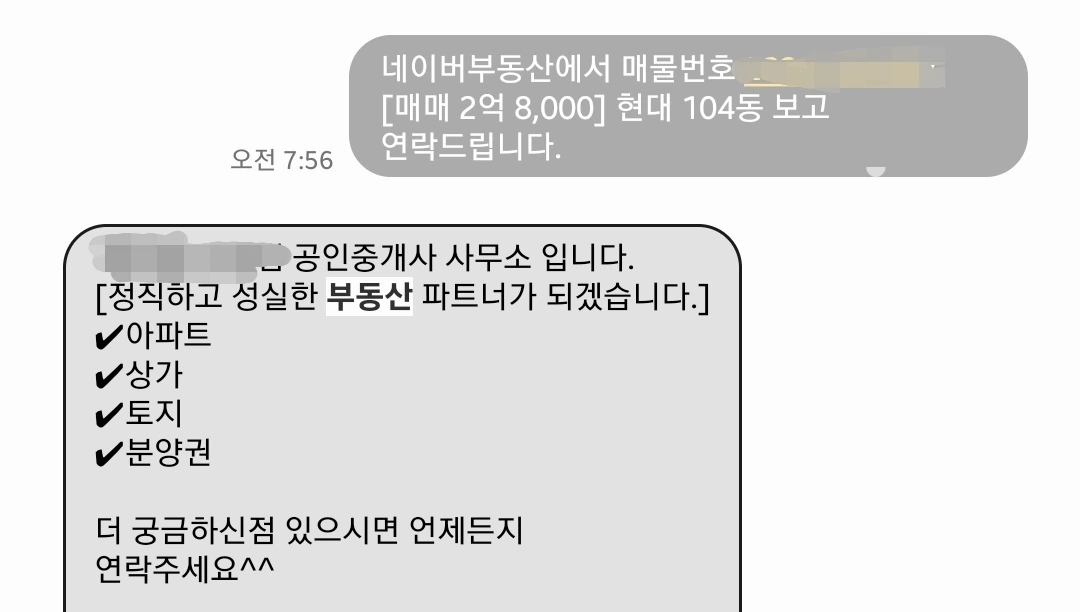 아래 이미지는 실제로 부동산에 [문자 상담]을 눌러 보낸 내용이다.