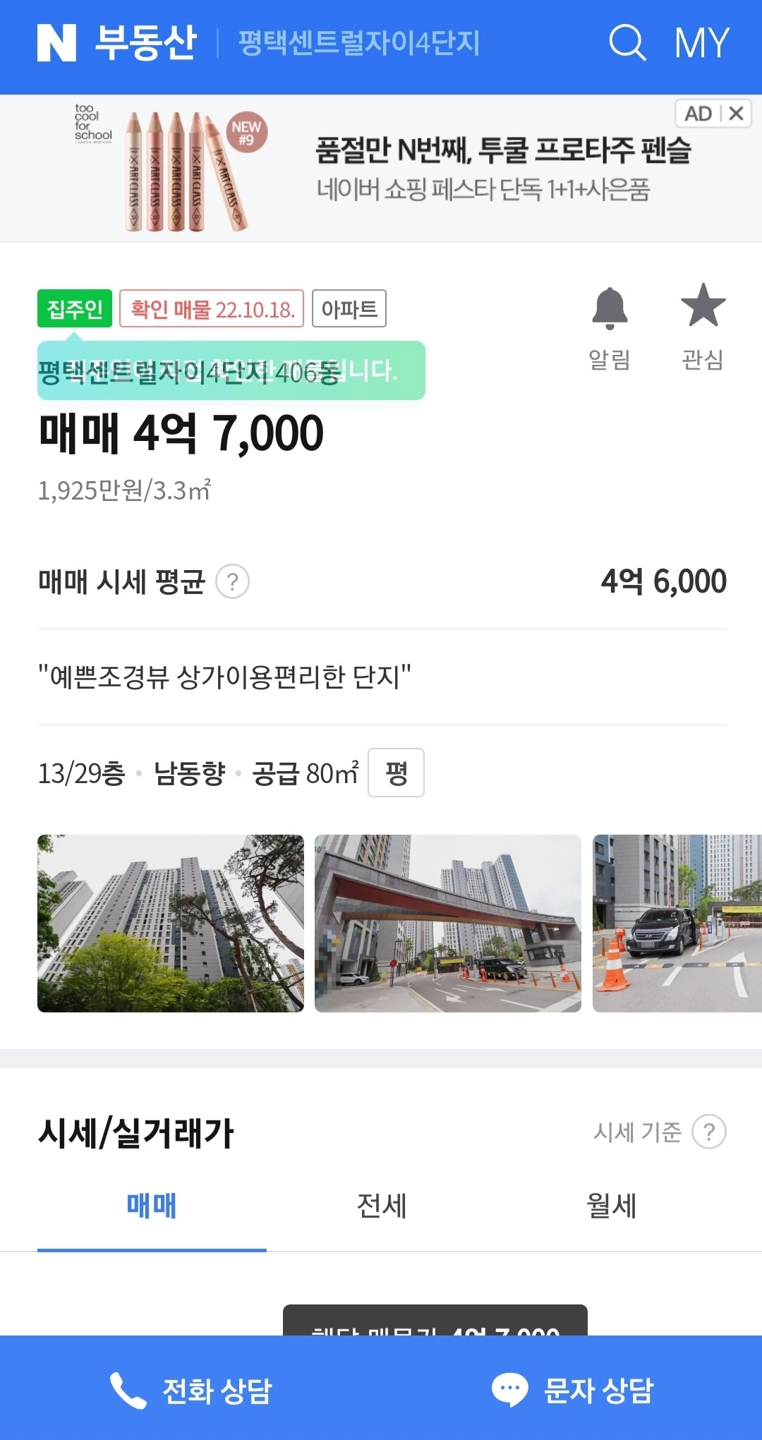 관심 매물 하단에 [전화 상담]과 [문자 상담] 버튼이 보기 좋게 위치하고 있어서