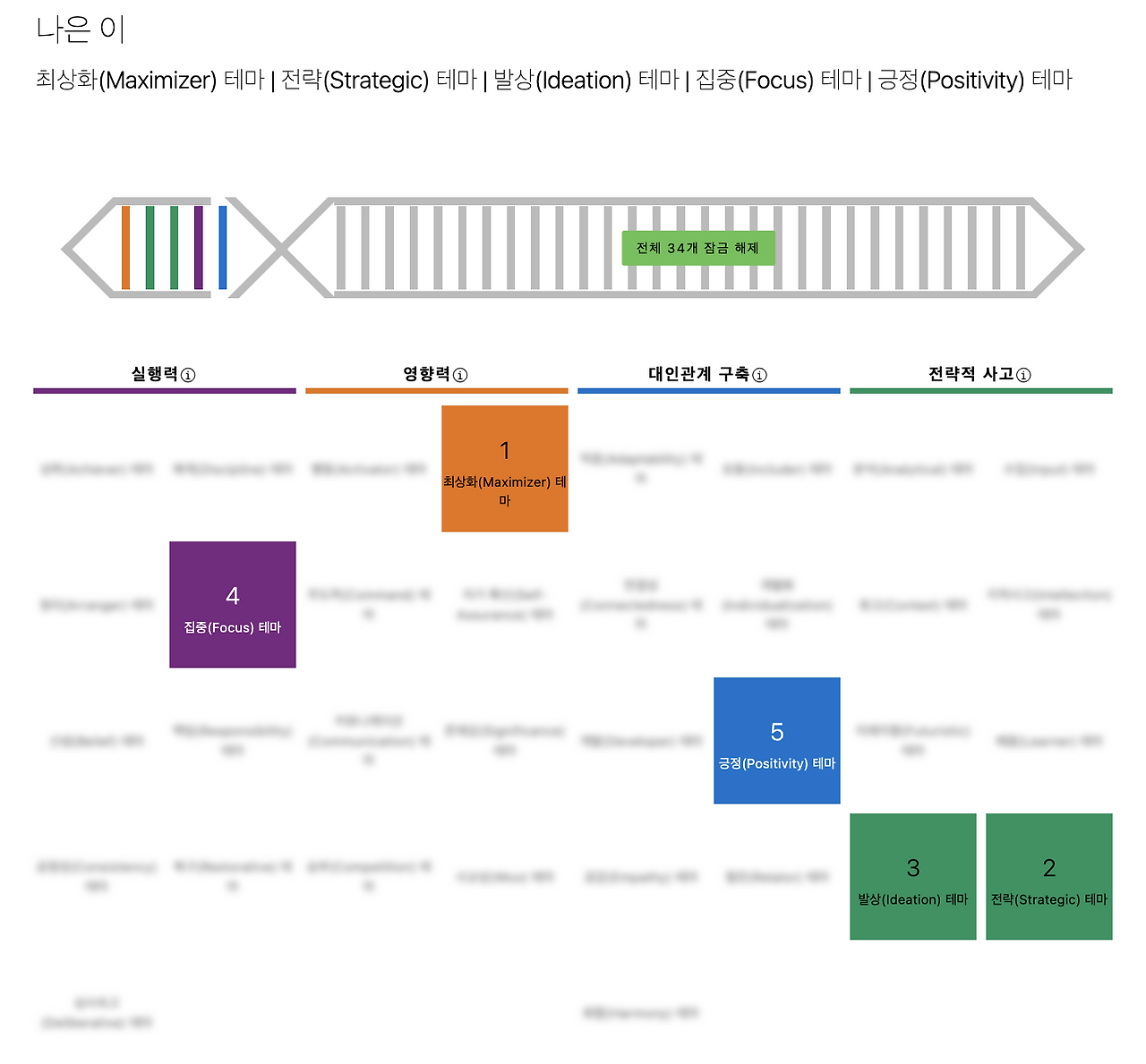 이는 측정된 34개의 특성 중 "가장 높은 특성 5개"에 해당됩니다. 대표 특성은 성공을 이끄는 소질을 최대한 개발하는 데 매우 중요한 요소입니다. 대표 특성을 개별적으로 또 는 조합하여 집중적으로 개발하여 자신의 소질을 파악하고 강점으로 개발하고, 일관되고 완벽에 가까운 성 과를 통해 개인 및 경력에 대한 성공을 누릴 수 있습니다