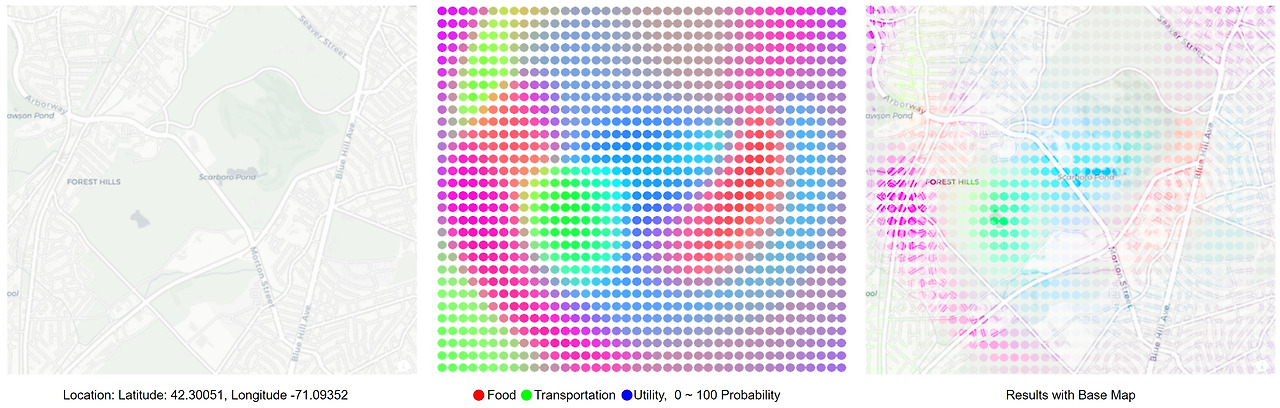 아래의 이미지는 Boston 지역에 학습된 모델을 적용하여 예측한 결과이다. 빨간색이 짙은 경우에는 (1) 음식 관련 장소의 확률이 높고, (2) 녹색의 경우 교통 관련, (3) 파란색의 경우 편의시설 및 유틸리티가 주된 장소이며, 이를 시각화해 주고 있다.