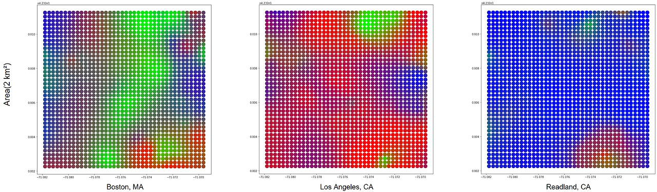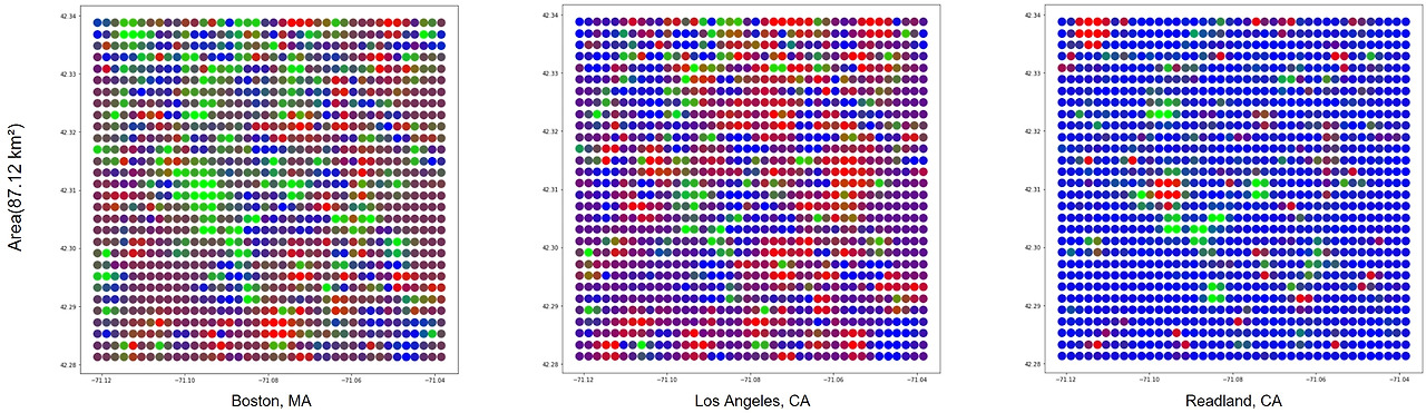 Boston 지역(87.2 km²)의 제3의 공간의 트렌드를 학습하고 예측한 결과이다. 그리고 LA와 Redlands지역 데이터로 학습된 모델을 동일한 공간에 적용, 예측한 결과 값이다. 주요한 제3의 공간의 밀도 분포들을 한눈에 볼 수 있다. 스케일을 줄여보자.