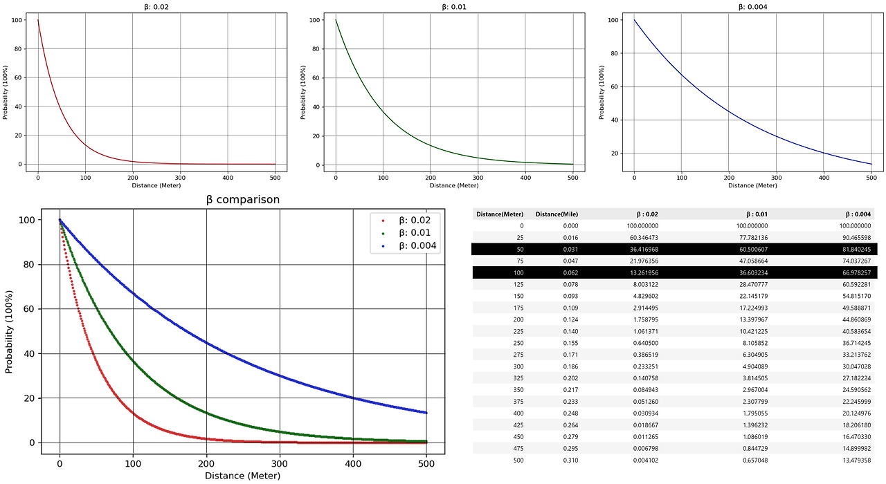 따라서 두 가지 방법을 소개하겠다. 첫 번째는 5분, 10분, 15분 걸어서 갈 수 있는 장소를 한계로 가중치를 계산한다. 둘째는, 거리가 멀수록 외부 환경이 나쁠수록 특정 공간까지 갈 수 있는 확률이 낮아(Decay)지는 방식으로 데이터를 가공한다. 아래의 표를 보면, 100미터에 위치한 장소를 접근할 확률이 β값이 0.02의 경우 약 15%, β: 0.01의 경우 약 38%, 그리고 β: 0.004의 경우 약 70%의 확률을 가지게 된다. 즉 100명의 사람이 있다면 날씨와 도보 환경에 따라, 15명, 38명 그리고 70명의 사람들이 그 장소에 도달을 한다는 것을 의미한다.
