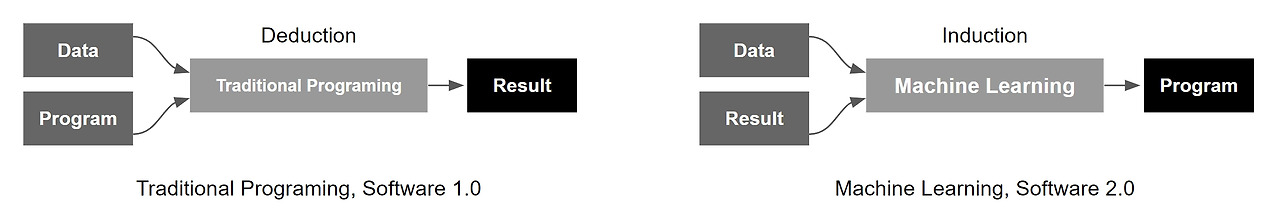 인공지능 구현에는 다양한 방법들이 있지만, 현실에서 경험하는 대부분의 인공지능은 머신러닝(기계학습)으로 구현된다. 즉 입력된 데이터에 의해서 프로그래밍되는 것이다. 아래의 그림을 보면, 전통적으로 프로그래밍을 한다는 것은 목적에 따른 순차와 조건을 정의하여 결괏값을 반환하도록 그 프로그래밍의 내용을 설계(연역법)하는 것이다. 그러나 머신러닝은 반대를 취한다. 즉 수많은 데이터가 결과로써 먼저 주어지고, 그 결괏값을 통해서 그 과정을 유추하여 프로그래밍의 내용을 역설계(귀납법)하는 것이라 볼 수 있다. 이러한 과정을 학습(Learning)이라고 하고 학습이 잘 됐을 경우 적합(Fitting)이 잘 되었다고 이야기한다. 가령, 구구단과 같이 결정론적(Deterministic)인 명시적 함수를 구현할 때는 전통적인 방식(연역법)이 당연히 유리하다.
