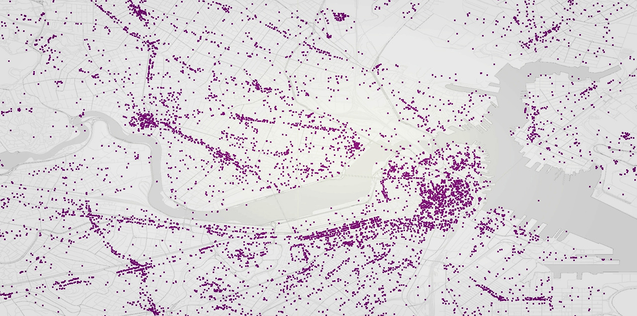 다음의 이미지는 Boston의 각각의 장소들을 디지털 공간에 매핑을 한 예이다. Boston과 Cambridge 지역에, 총 95개의 카테고리(병원, 공원, 도서관, 편의점...)로 4,250개의 제3의 공간 데이터가 시각화되었다.