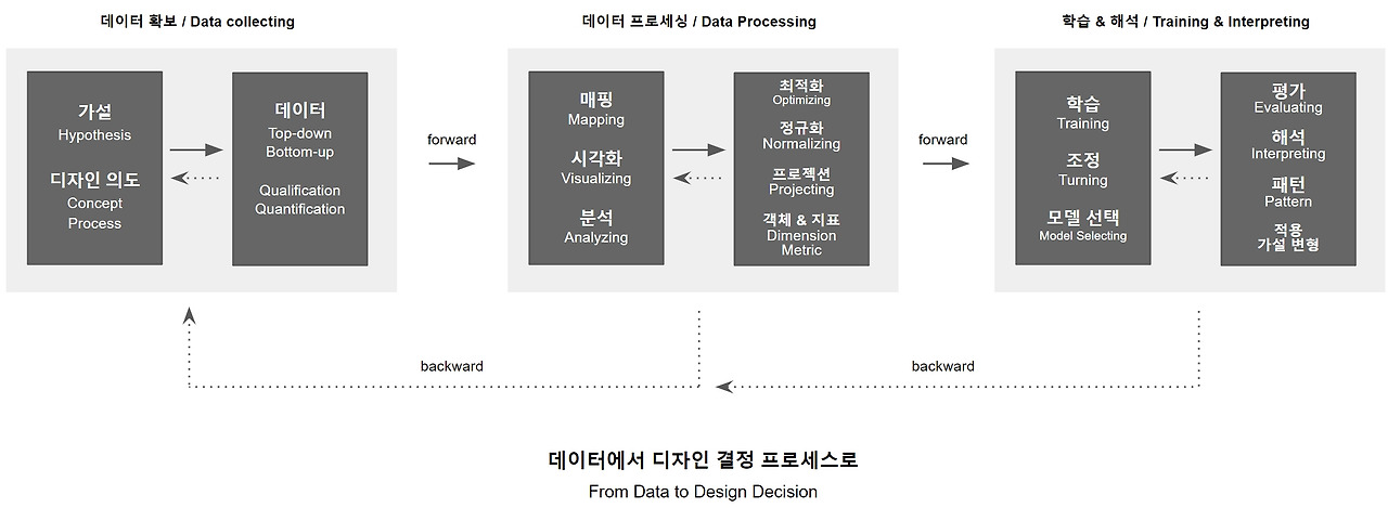 인터넷을 통하여 접근하는 대부분의 원시 데이터(Raw Data)는 목적에 따라 정제되면 좀 더 높은 수준의 모델링을 할 수 있다. "쓰레기를 넣으면 쓰레기 값이 나온다(GIGO: Garbage in, garbage out)"는 말이 있듯이, 데이터를 이해하고 순도를 높이는 과정은 재료(데이터)와 정제 도구(코드, 인공지능, 알고리즘 등등)를 사용할 때 반드시 거쳐야 되는 지점인 동시에, 디자이너가 개입하여 전공 지식(Domain Knowledge)을 발휘해야 하는 단이기도 하다. 데이터를 모으고 정제를 통해, 목적을 성취하고 가설을 설명할 수 있는 학습 가능한 데이터를 생성, 미세 조정해야 한다는 것이다. 마치 하나의 원자재를 다듬어 목적에 맞는 다양한 건축물을 디자인하듯, 데이터 기반 사회 패러다임에서 디자이너에게 "데이터 정제 프로세스"는 비약 없는 명시적 논리 흐름이고 곧 디자이너의 "디자인 프로세스"가 되는 것이다.