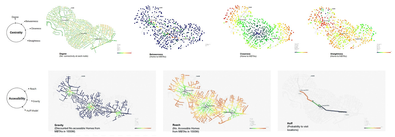 동시에, 전통적인 도시 네트워크 분석 방법을 적용할 수 있다. 가령, 중심성(Centraility) 분석에는 Degree, Betweenness, Closeness, Straightness 모델들이 존재하고, 접근성(Accessibility) 분석에는 Reach, Gravity, Huff 모델과 같은 분석법을 적용, 혼합하여 거리 함수를 목적에 따라 구현, 적용할 수 있다.