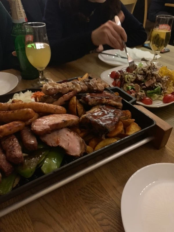 주문하면서 작지 않을까 했는데 예상과는 다르게 많이 남겼다. 양도 많았지만 너무나도 짰기 때문이다. 특히 가장 많은 기대를 했던 고기와 소시지가 가특한 플레이트는 염전인 줄 알았다. 유럽 사람들이 대부분 짜게 먹지만 지금껏 먹었던 음식은 생각보다 짜지 않고 맥주와 먹으면 적당히 먹을만했다. 하지만 Less salty의 법칙을 깜빡하고 이곳 생활에 적응했다는 오만함의 결과가 하필 오늘, 첫 만남에 들뜬 우리에게 다가왔다. 결국 다 먹지 못하고 남긴 것을 너무나도 아쉬워하며 우리는 맥주를 들이부었다. 그래서 내가 맥주 한 병을 그렇게 빠르게 비웠을까?