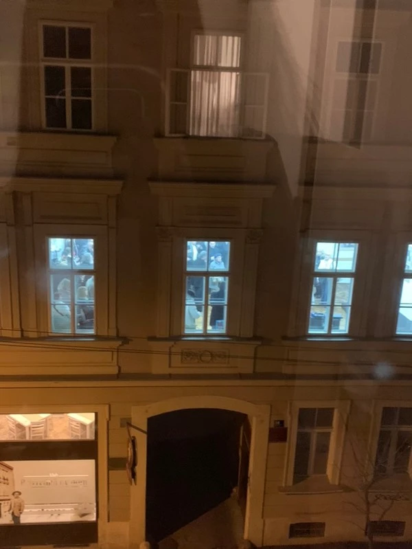 추운 몸을 녹이기 위해 샤워를 하고 방 정리를 하면서 밖을 문득 보았는데 이게 무슨 일인가? 바로 건너편 건물 1층(유럽은 한국의 1층이 0층에 해당됨)에서 눈대중으로 30명은 넘는 사람들이 모여 있는 것을 발견했다.