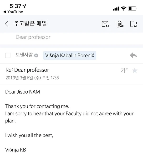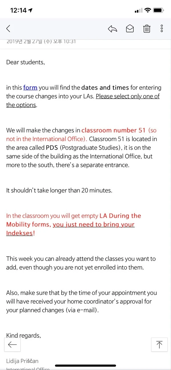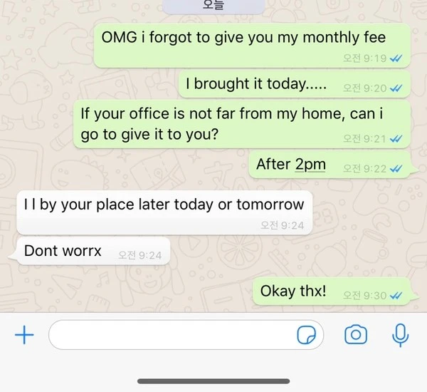 9시에 첫 수업이 있어서 Vedran과 후다닥 Bye 하고 정신없이 학교로 향했는데, 이럴 수가... 월세 주기로 한걸 나도 깜빡하고 Vedran도 까먹었다. 솔직히 급한 게 아니라 나중에 줘도 상관은 없다. 하지만 나중에 안 받았다는 둥 딴 소리를 할까봐 주고 싶다는 의도를 내뿜는 문자를 남겼다. 역시 무슨 일이든 기록으로 남겨야 한다. 한국이었으면 계좌이체를 위해 은행 앱도 안 깔고 바로 카카오 뱅크로 보냈을 일이다. 결국 Vedran은 월세와 보증금을 다음날 받으러 왔다. 언제 어딜 가나 돈 받는 거는 좋은 거니까^^