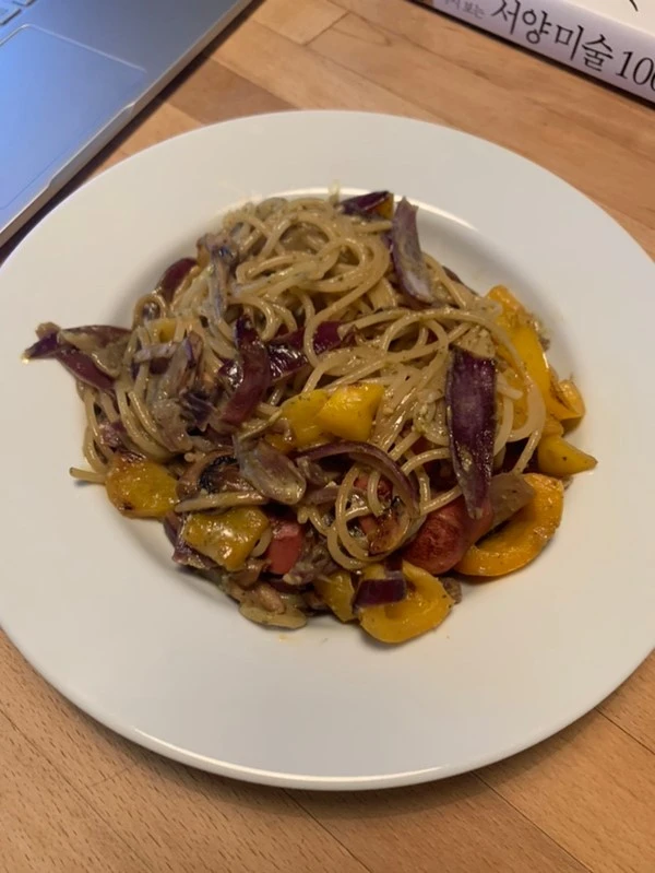 여행을 다녀왔더니 과제 있었던 걸 까먹고 있었다. 밀린 구몬 숙제처럼 과제를 꾸역꾸역 하다 보니 하루 한 끼만 먹고 있었다.(요거트 맞다) 과제를 거의 다해갈 때 즈음 저녁으로 또 바질 페스토로 파스타를 해 먹었다. 간도 페펙트 하고 양도 퍼펙트했다. 원래 같았으면 스파게티 면을 삶을 때 이 정도는 많은가? 싶을 정도로 넣어서 항상 양 조절에 실패했는데 오늘은 평소보다 면은 작지만 양파, 파프리카, 소시지를 넣어서 양을 조절했다. 특히 파프리카로 색도 내고 씹히는 맛도 낸 점에 있어서 굉장히 후한 점수를 주고 싶다.