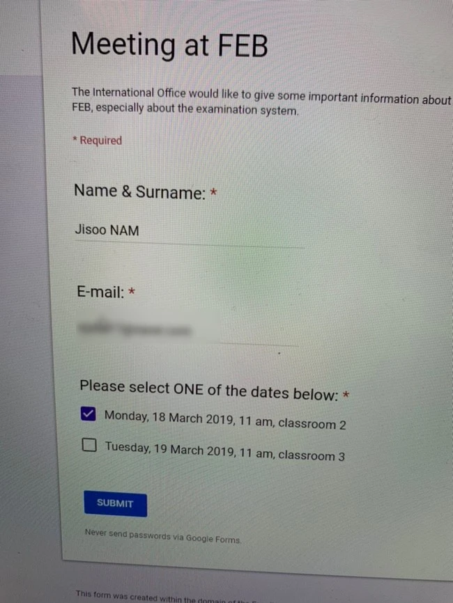 학교로부터 교환학생들에게 중요한 정보를 알려주기 위해 자리를 마련한다는 메일을 받았다. 네이버 블로그에서 미리 살펴본 교환학생 일지에는 개강 전 학교 측에서 마련한 오리엔테이션을 참여하라는 소식을 글로 배웠다. 꼭 참여해야지 하고 마음먹고 있었는데 내가 모르는 사이에 그 행사는 쏜살같이 사라져 버렸다. 대신 학부에서 조촐하게 마련한 자리를 참석할 수 있도록 메일까지 보내주다니. 조금 섭섭했지만 불쌍한 놈 떡 하나 더 준다는 마음으로 챙겨주는 느낌이라 재빠르게 참석 요일을 체크했다. 드디어 우리 경상대도 모이는 건가... 진작 했어야 했어.