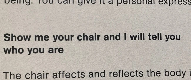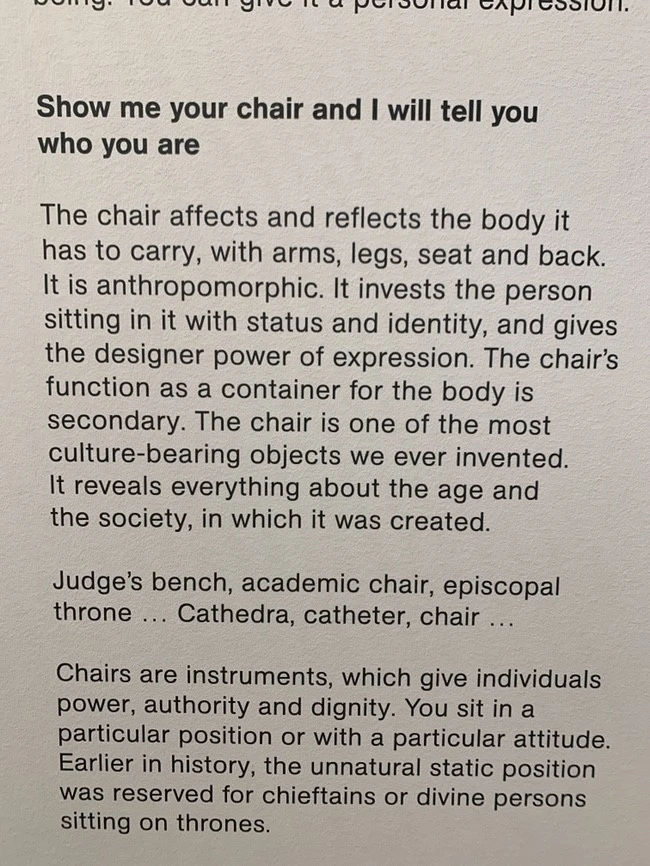 의자 세상에 온 것 같은 이곳. 나는 의자에 대한 생각을 이 문구를 보고 다시 했다. "너의 의자를 나에게 보여줘. 그러면 나는 너에게 네가 누구인지 말할 것이다.(말할 수 있다.)" 그동안 나는 무슨 의자에 앉아 왔는가? 의자는 공부나 일을 하기 위한 책상의 짝꿍 정도, 보조적인 역할 정도로 생각해왔다. 그런데 의자만 보고도 나의 성향을 말할 수 있다니.