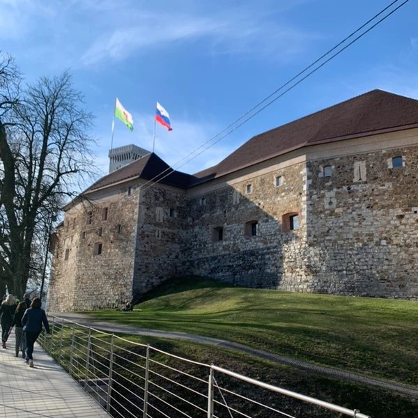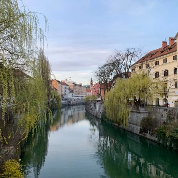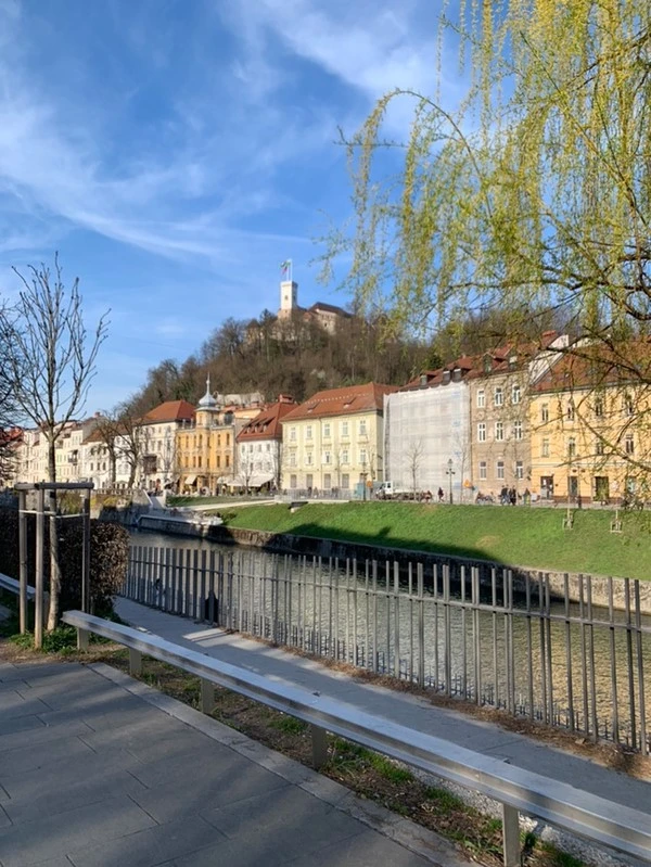 그 길로 쭉 내려왔더니 너무나도 아름다운 운하? 수로? 가 있었다. 저기 언덕 위에 보이는 성이 우리가 방금까지 있었던 '류블랴나 성'이다. 위에 있을 때는 못 느꼈지만 막상 내려오니 생각보다 높은 위치에 있어서 놀랐다. 약 오후 3시쯤이어서 그런지 따뜻한 햇살이 도시 전체를 감쌌고 건물의 색깔이 알록달록한 게 햇빛을 받으니 더욱더 아름답게 느껴졌다.