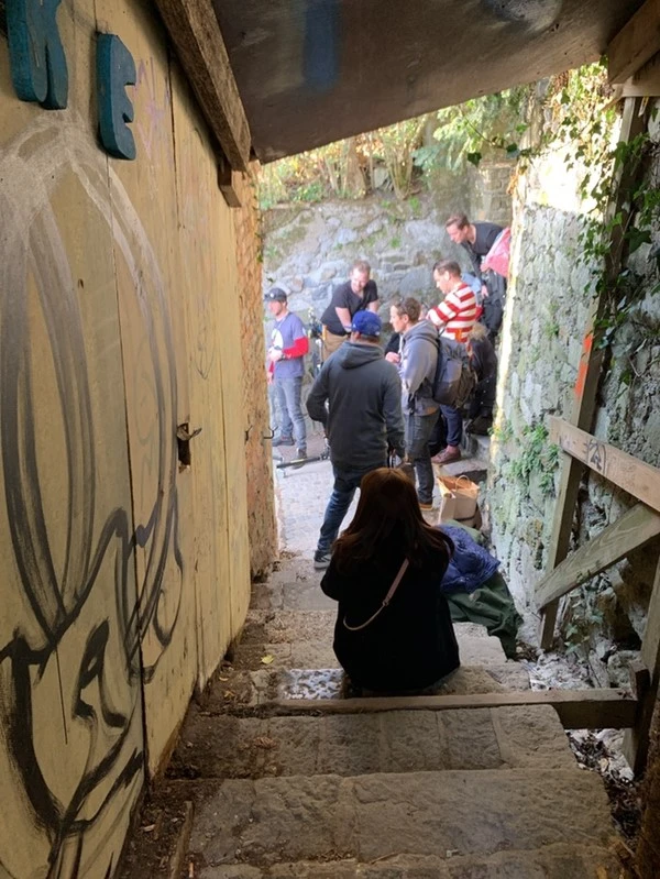 한참을 걸어서 그런지 목도 마르고 앉아 쉬고도 싶어 한 카페로 향했다. 가는 길을 구글 지도에 검색해 가라는 대로 움직였을 뿐인데 가장 빠른 길만을 알려준 것인지 오르락내리락거리는 계단 길을 우리에게 알려주었다. 힘들어 죽겠다. 조금씩 움직이는 GPS 파란 점을 보며 걸어가니 골목 끝자락에 한 무리의 사람들이 모여 있었다. 그들 중 한 사람이 "미안하지만 우리가 촬영 중이라서 5분 후에 지나갈 수 있어"라고 말했다. 마침 우리도 잠시 쉬어갈 겸 계단에 걸터앉아 숨죽이며 그들을 지켜보았다. 무슨 촬영인지 알 수는 없었지만 카메라도 보이고 매니저처럼 보이는 관계자도 여럿 있었다. 컷 하는 소리와 함께 우리는 지나갈 수 있었고 어린 연기자들이 모여 있는 것을 볼 수 있었다.(지금 곰곰이 생각해 보면 유아 영화 촬영장이었던 것 같다)