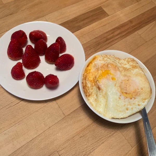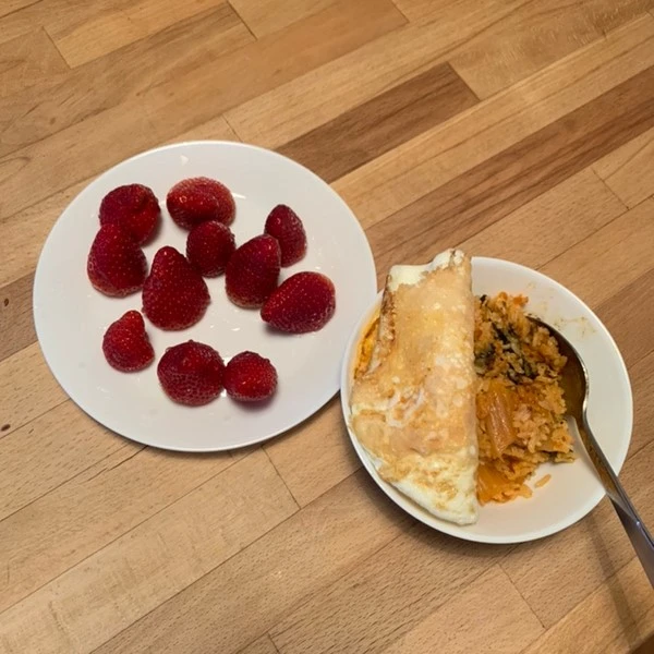 오늘도 볶은 김치와 밥, 김가루, 빠질 수 없는 계란 프라이. 계란 덕후이니까 당연히 프라이는 두 개를 하고 이불처럼 살포시 덮어주었다. 후식으로는 딸기까지. 정말 완벽한 식사인 것 같다.