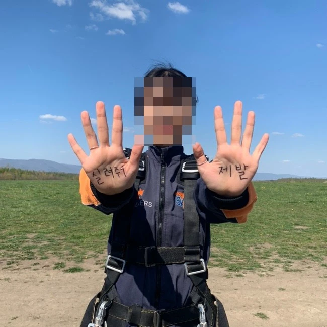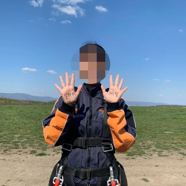 이곳 비행장에 한국인들이 많이 와서 그런지 직원들의 말솜씨가 장난이 아니다. 장난을 치다 보니 어느새 나의 몸에는 수많은 안전장치가 몸에 딱 맞게 꽉 조여져 있었다. 꺄-! 내가 진짜 스카이다이빙을 하다니.... 바람이 많이 불어서 앞머리는 포기했다. 먼저 스카이다이빙을 뛰고 온 한국인 한 분이 매직펜을 하나 쥐어주더니 손바닥에 멘트를 쓰고 사진을 찍어야 제대로 뛴 거라고 하셔서 나도 진심을 담아 몇 자 적어 보았다. 부끄럽긴 했지만 화이팅 넘치게 사진을 찍었다(살짝 많이 마음에 드는 부분)