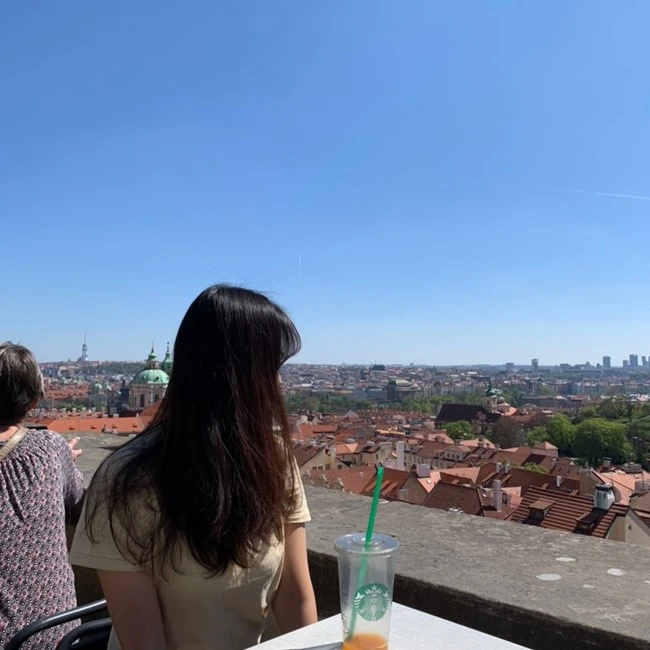 한참 동안 귀로만 듣다가 문득 행사가 끝나면 사람이 몰릴 것이 분명하다는 생각이 들어 우리는 빠르게 자리를 옮겼다. 프라하에 오면 한 번쯤 와봐야 한다는 그 유명한 프라하성 스타벅스. 시키려고 했던 메뉴가 죄다 품절되었다는 슬픈 소식을 들어 반 강제로 아메리카노를 마시게 되었다. 하지만 너무 오랜만에 아이스 아메리카노를 무려 그란데 사이즈로 마시게 되어 너무나도 행복했다. 리유저블 컵도 함께 구매해 의도치 않게 기념품도 챙길 수 있었다. 눈길이 계속 가던 프라하 시내. 전망대도 아니고 그 흔한 스타벅스에서 커피를 한 잔 하며 프라하 시내를 둘러볼 수 있다니... 스타벅스가 돈을 쓸어 담겠다고 단단히 마음을 먹었다는 생각과 동시에 이곳에서 일하는 직원들이 힘들겠다는 생각도 동시에 들었다.(힘^^)