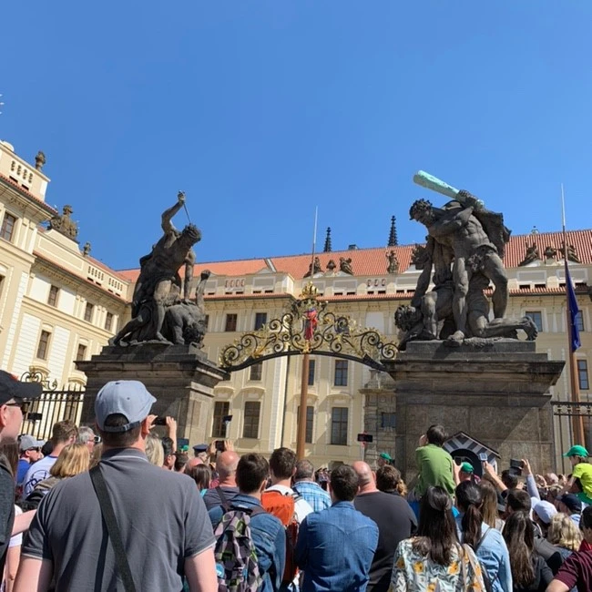 프라하 성을 프라하에 도착한 날부터 가야지, 가봐야지 라는 생각을 했다. 하지만 함께 여행할 친구보다 하루 일찍 도착했기 때문에 나중에 함께 가야지라는 생각을 하다가 결국 프라하를 떠나는 마지막 날에 오게 되었다. 트램에서 내린 후, 관광객들이 한 곳을 향해 걸어갔는데 우리가 가고자 하는 곳과 같겠지 라는 생각에 우리도 그들의 행렬에 함께했다. 한참을 걸어 올라가다 보니 MatthiasGate에서 12시 근위병 행사가 이루어졌다. 키 큰 관광객들이 많아 한국에서는 꽤 키가 큰 편에 속하던 나는 166밖에 안 되는 꼬맹이가 되어 보는데 많이 힘들었다. 그래도 이걸 보자고 힐을 신고 올 수는 없다는 생각에 그냥 소리만 듣는 걸로 만족했다. 문 입구에 놓여있는 동상이 너무나도 무섭게 생겨서 시선을 뗄 수가 없었다.