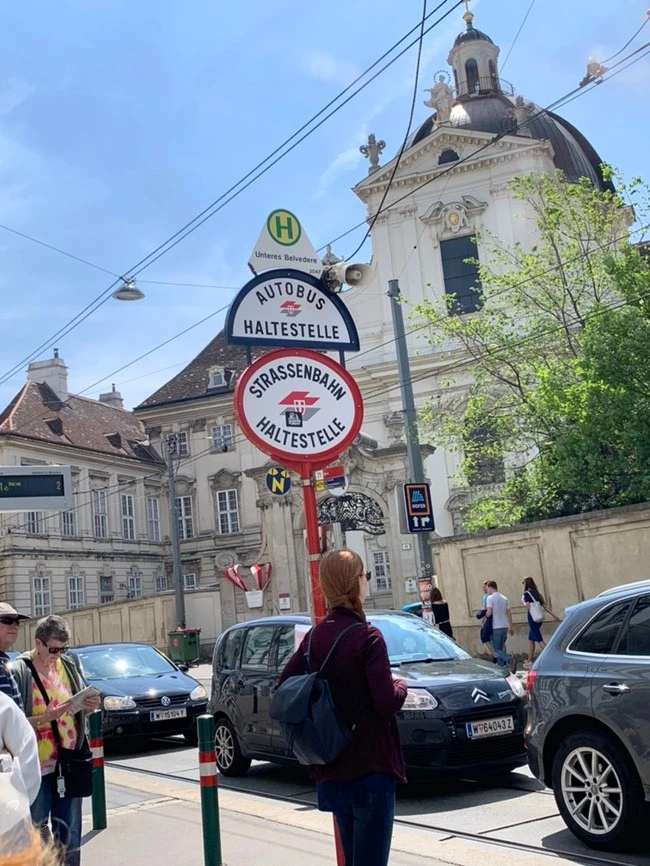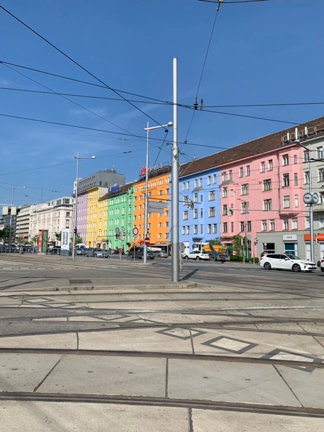 오늘도 역시 날씨가 맑은 오스트리아. 여행의 8할은 날씨가 다 한다는 말이 맞는 것 같다. 길을 나설 때부터 흥얼거리는 내 모습을 보고 있자니 스스로도 당황스러웠지만 그만큼 날씨가 좋다는 말이니 그러려니 하고 그 기분을 즐겼다. 숙소에서 나와 트램을 타고 내린 한 정류장에서 바라본 곳, 자그레브와 다르게 건물 외벽 색깔이 너무 예쁘다.