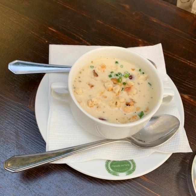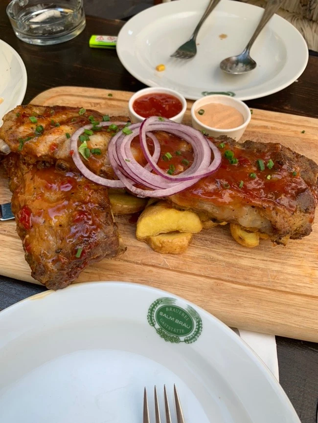 Salm Braeu. 벨베데레 궁전 근처에 맛집이 있다는 한 블로거의 말을 믿고 관람을 끝내자마자 곧장 이곳으로 향했다. 궁전에서는 약 5분 거리 정도? 배가 매우 고픈 상태였던 나의 마음에도 들 정도로 가까운 거리였다. 일단 앉자마자 라들러를 주문했다. 가격이 조금 더 저렴한 생맥주 스타일을 주문했는데 병이 제일 맛있다는 것을 깨달았다. 이 맥주는 니맛도 내 맛도 아닌 맛이라 실망스러웠다. 갈릭 수프와 샐러드, 메인으로 립을 주문했다. 갈릭 수프는 적당히 고소하고 느끼해서 든든하게 딱이었다. 식사를 하며 풀을 안 먹어주면 죄책감이 들기에 자연스럽게 샐러드를 주문했다. 화장실을 편안하게 가기를 희망하며 기대 없이 주문했는데, 웬걸? 샐러드를 주문한 게 정말 신의 한수일 정도로 최고의 선택이었다. 맛도 있었지만 식사 중간중간에 리프레시시켜주는 역할도 담당했기 때문이다. 립 맛집인 거는 알고 있었지만 유럽을 여행하며 이 날이 제일 잘 먹은 날인 것 같다. 최고다. 이 글을 보는 사람 중 오스트리아 여행을 계획하고 있다면 이곳을 꼭 가봤으면 좋겠다. (참고로 사진으로 보이는 저 양이 1인분이다 꼭 샐러드와 립을 주문하세요)