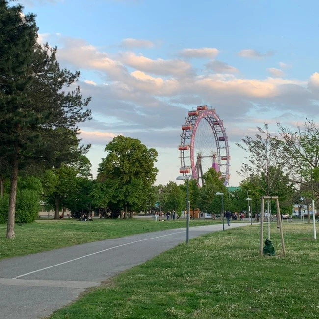 모든 일정을 마무리하고 힘이 들어 잠시 숙소에 가는 길, 공원을 가로질러 가는데 전날에는 보지 못한 풍경을 마주할 수 있었다. 공원 근처에는 작은 놀이동산이 있었는데 그중 동그란 관람차가 나의 눈에 문득 들어왔다. 힘들었던 하루를 보내며 피곤이 가득했는데 이 장면을 보자마자 피로가 싹 풀렸다. 아름답고 또 아름답다. 숙소에 들어가 잠시 쉬다가 지원이와 나는 비엔나에서 보내는 마지막 날을 그냥 보내기 아쉬워 또 동행을 구했다. 그들과 저녁을 먹으러 나가는 길에 발견한 노을 지는 하늘, 순간순간을 놓치기 싫은 날이다.