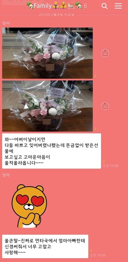 크로아티아와 한국의 시차는 7시간. 그럼에도 불구하고 매일 가족들과 통화를 하며 서로의 안부를 묻는 것은 하루 일과 중 중요한 일정이 되었다. 어느덧 자그레브 생활이 익숙해갈 때 즈음 한국은 어버이날이 돌아오고 있었다. 꽤나 엄마와 아빠는 나에게 의지를 하면서도 아직까지는 어린애라고 생각하는지 외국에 나가 혼자 사는 나를 엄청나게 걱정하신다. 밥은 잘 챙겨 먹는지 아픈 데는 없는지. 이번 어버이날에는 걱정이 아닌 기쁨을 줄 수 있는 자식 노릇을 하고 싶었고 어버이날 전날 급하게 꽃집에 연락해서 꽃배달을 예약했다. 다음날 주문한 꽃바구니와 쪽지가 무사히 집에 잘 도착했는지 일어나니 아침부터 엄마가 카톡을 보내줘서 괜히 뿌듯했다. 종종 이런 이벤트,,, 좋은 거 같다.