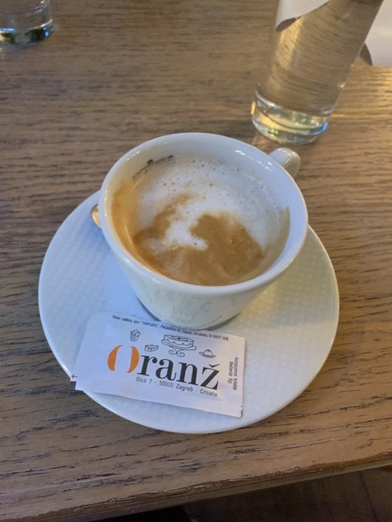 집으로 바로 가기엔 아쉽기도 하고 항상 식사 후에는 커피나 차를 마시는 게 버릇이 되어 근처의 카페로 들렀다. Oranz Bistro & Wine Bar. 자그레브에 도착한 후 처음으로 혼자만의 시간을 가졌던 공간인 이곳, 오랜만에 방문해서 그런지 반가웠다. 주문을 하고 카페 안쪽에는 처음 들어와서 매장을 잠시 둘러보았는데 창가에서 이전에 보지 못했던 기계를 발견했다. 바로 젤라또 기계! 처음 보는 기계가 신기하기도 했지만 둥글게 생긴 기계의 모양과 더불어 엄청나게 큰 사이즈에 언뜻 보아도 종류가 다양해 보이는 맛 때문에 한 번쯤 먹어보고 싶은 욕구가 생겼다. 한 번쯤 와서 먹어봐야겠다. 한국에서는 웬만하면 아이스 아메리카노만 주문하는 나에게 유럽은 새로운 세계를 보여주었다. 주로 Esspresso with milk를 주문해서 마시는데 카페라떼는 거의 우유맛밖에 안나는 커피 음료 종류라 신기하지만 다르게 구분하는 것 같다.(예를 들어 Esspresso with milk는 샷이 2개 들어간다면 카페라테는 샷과 우유의 비율이 비슷하거나 더 많은 정도?)
