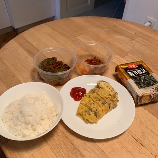 지원이의 빠른 귀가 이후에도 나는 한 2시간 정도 도서관에서 더 머물렀다. 엉덩이 무겁게 도서관에서 시간을 보내고 온 내가 너무나도 기특했다. 이런 날은 맛있는 걸 먹어줘야 한다는 생각에 피곤할 겨를도 없이 저녁을 준비했다. 오늘의 특식은 버섯 계란말이와 한국에서 공수한 밑반찬, 그리고 들기름이 발려진 김까지. 고슬고슬한 밥과 먹으니 너무나도 맛있었다. 이럴 때 보면 참 잘 챙겨 먹는 것 같다.