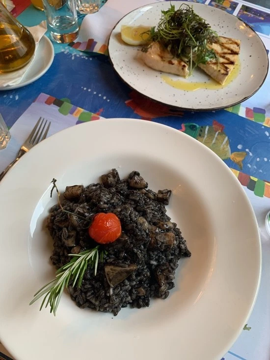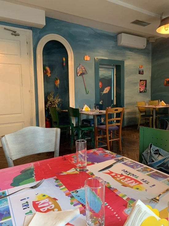 오랜만에 룸메이트와 저녁 외식을 하기 위해 시내로 나왔다. 엄밀히 말하면 내가 살고 있는 자취방이 시내에 있어 집 근처 밥집에 간 택이지만 그래도 이왕 외식을 하는 거 맛집을 찾아가고 싶어 열심히 서치를 해 방문했다. 산책을 하거나 등교할 때마다 한 번씩 간판을 본 적 있는데 2층에 위치하고 있어 장사를 하고 있는지도 몰랐다. 알고 보니 구글에서 꽤 유명한 레스토랑이었다. Ribice i tri toekice. 창가 쪽에 자리를 잡았는데 창 밖으로 보이는 하늘이 맑은 게 외식을 하기에 최고의 날씨였다. 어린이 식당인지 콘셉트가 의심 가는 인테리어인데... 물고기 나라에 온 줄 알았다. 나는 먹물 리조또, 룸메이트는 생선 머시기를 주문했다. 생선을 좋아하는 나였지만 생각보다 그저 그랬다. 하지만 내가 주문했던 먹물 리조또는 꽤 맛있어서 룸메이트와도 나누어 먹었다.