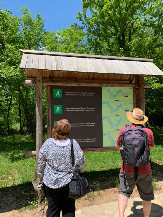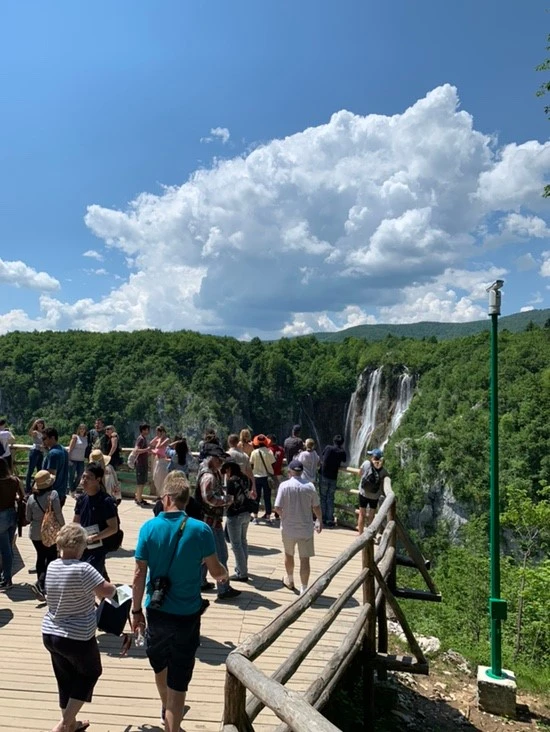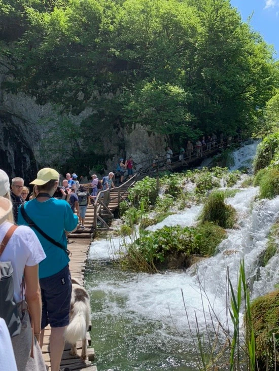 무려 160쿠나나 하는 입장권. 마- 이게 그 플리트비체 입장권이다! 본격적으로 들어가기 전 초입에 세워진 안내판으로 코스를 확인했다. 날씨가 화창하긴 하지만 생각보다 햇빛이 강렬해 매우 더웠던 탓에 초반의 기세는 조금 약해졌다. 결국 우리는 체력 거지라는 꽤 논리적인 이유로 제일 짧은 A코스로 가기로 했다. 들어서자마자 사람들이 복작복작해서 엥? 저기에 뭐가 있나?라는 마음으로 우리도 한발 한발 다가갔다.