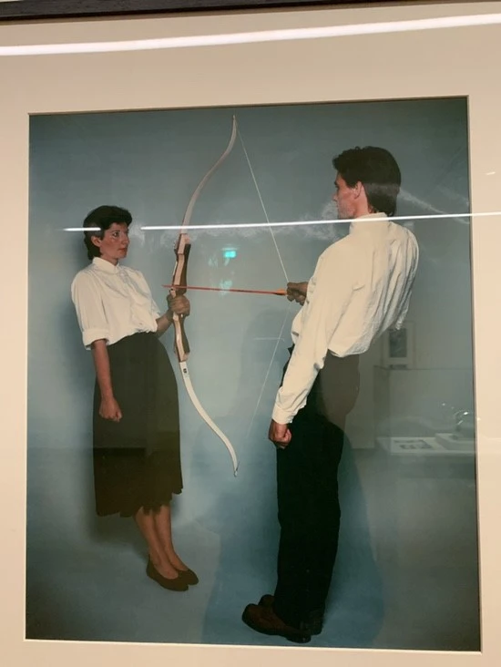 회사에 가기 싫은 직장인을 뜻하는 건가? 아침마다 정장을 입고 회사로 향하는 좀비 같은 사람들의 마음을 잘 드러내는 작품이었다. 시실 볼 때는 잘 몰랐는데 그 유명한 '마리나 아브라모비치'의 작품도 있었다. 유고슬라비아 출신의 도발적인 포퍼먼스를 하는 예술가로 유명한 그녀는 유튜브에서 '퍼포먼스 도중 22년 만에 만난 연인'이라는 이름으로 올라온 한 영상으로 인해 한국사람들에게 제일 잘 알려져 있다.(실제 퍼포먼스의 이름은 '예술가는 여기 있다(The Artist is Present(2010))') 이 영상에 등장하는 그녀의 연인 울라이(Ulay)와 함께한 작품이 꽤 많은데 이곳 미술관에서 본 작품 대부분도 그가 등장하지 않은 작품이 없었다. 특히 가장 오른쪽의 사진은 '정지 에너지(Rest Energy)(1980)'라는 이름을 가진 작품인데 이 또한 많은 생각을 하게 만들었다.
