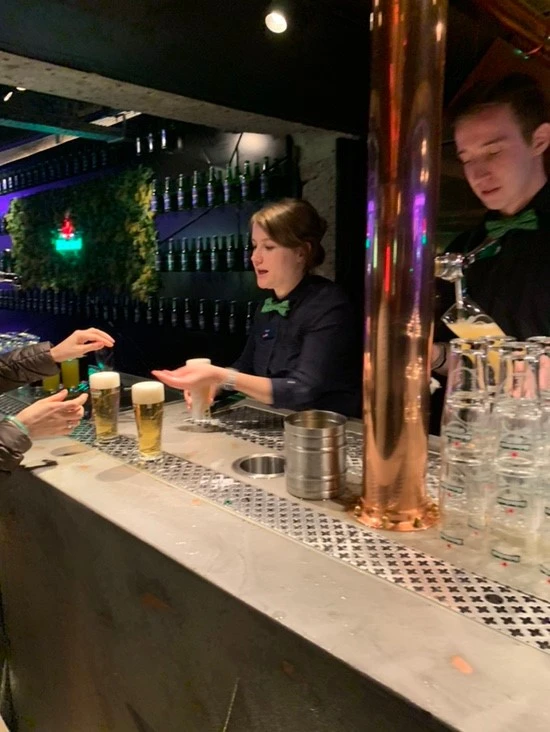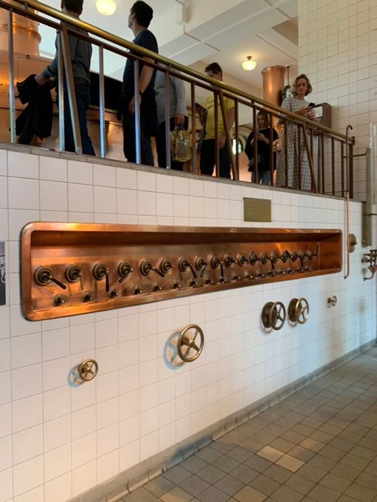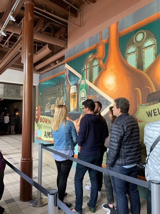 여긴 어딜까요? Heineken Experience. 이곳은 글로벌 맥주 브랜드로 유명한 하이네켄의 역사와 맥주 만드는 과정을 직접 볼 수 있는 체험 공간이다. 덴마크의 효자 기업인 하이네켄의 공간에 한 번쯤 와보고 싶었던 나는 이곳을 함께 방문할 동행을 구했는데 놀랍게도 바로 1시간 전에 약속을 취소해버렸다. 기분이 많이 상했지만 어쩌겠는가. 나 혼자서라도 가야지? 미리 입장권을 구매한 나는 직원에게 e-쿠폰을 보여주니 팔찌 하나를 주었다. 그리고 팔찌에 있는 단추 같은 게 쿠폰 같은 거라고 설명해줘서 잃어버리지 않게 품고 있었다. 2시에 함께 투어 하는 사람들은 나를 포함해 줄을 서서 기다렸고 얼마 지나지 않아 한 직원 언니가 앞쪽에 섰다. 완전 서비스직에 찰떡인 것 같은 성격을 가진 이 언니의 잠시 들은 후 건물 안쪽으로 들어가서 모기 목소리를 가진 남자분의 설명도 들었다. 다양한 사람들이 이곳에 있구나?