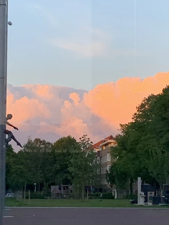 굴다리 같은 곳을 지나가다가 만난 사람들. 버스킹을 하는 밴드였는데 일반적인 버스킹과 달리 바이올린부터 트럼펫, 그리고 아코디언까지 연주하는 사람들이라 더욱 눈길을 끌었다. 여행은 이런 상황을 갑작스럽게 마주하면서 경험하는 것들로 차곡차곡 채워지는 것 같다. Moco Museum에 뱅크시 작품이 있어서 패스카드로 한번 들어가 보려고 했다. 하지만 이곳은 패스카드로 입장이 불가했다. 예상치 못한 변수라 조금 당황하긴 했지만 굳이 입장료를 내고 들어갈 필요는 없다고 생각해 입장하지 않고 곧장 밖으로 나왔다. 그러다가 어제 만났던 진주 언니에게 연락이 왔는데 근처의 반 고흐 뮤지엄에 있다는 소식을 들었다. 연락 오면 반가운 사람이라 그런지 고민하지 않고 언니가 나오기만을 기다리며 뮤지엄 앞에 자리를 잡고 앉았다. 뭉게뭉게 구름이 시선을 사로잡았다.