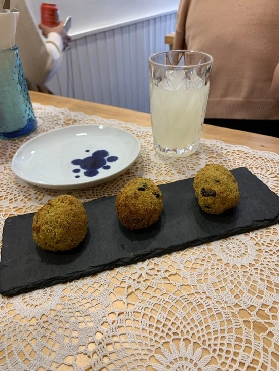 오늘 아침 겸 점심은 혼자 먹으려고 했다. 하지만 집을 나서기 직전 우연히 들어가 본 유랑 카페에서 함께 밥을 먹을 사람을 구한다는 글을 발견했다. 혼자보다는 둘이 낫겠지라는 생각에 곧장 레스토랑으로 향했고 제일 먼저 도착해 동행을 기다렸다. Voltaria. 처음 보는 여자 세 명이서 식사를 하다니, 한국이었으면 상상도 못 했을 것 같은데 유럽이니까 정말 자연스럽게 서로 인사하고 메뉴를 들여다보고 음료를 주문했다. 처음 만났지만 생각보다 말이 잘 통했는데 문득 동행을 하는 사람들은 대부분이 MBTI에서 E가 아닐까 하는 생각이 들었다. 그렇지 않고서야 이렇게들 낯을 안 가릴 수가 없다. 호탕한 주인아주머니가 주문을 받아주셨는데 나까지도 기분이 좋아졌다. 오늘도 나는 역시나 샹그리아를 주문했는데 지금껏 마셔본 샹그리아 중 가장 맛있었다. 음료를 마시고 있으니 주문한 메뉴가 하나씩 나와 테이블을 가득 채웠다. 가장 먼저 나온 메뉴는 대구살로 만든 크로켓 같은 음식이었는데 동행 중 한 명이 이 메뉴가 맛있다고 해서 애피타이저로 주문했다. 그런데 크로켓의 핵심인 따뜻함과 바삭함이 없어 실망했다. 그래도 이곳에서 맛본 첫 음식이기에 다 먹었다.