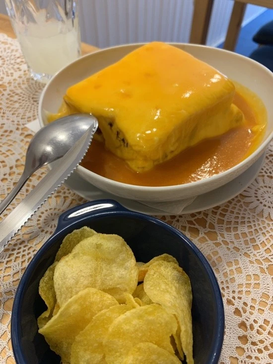 얼른 다음 메뉴가 나오기를 기다렸고, 곧장 문어 샐러드가 나왔다. 한번 문어를 맛보고 나니 이제는 포르투에서 빠트리면 섭섭할 정도로 무조건 주문해야 하는 메뉴가 되었다. 그리고 함께 나온 오늘의 하이라이트 음식! 바로 포르투갈의 전통음식 중 하나인 '프란세지냐' 원래는 에어비앤비에 있는 액티비티(활동) 만들기 체험을 해보려고 했다. 왜냐하면 에어비앤비 포르투갈에서 제공되는 액티비티 중 유일하게 한국인이 진행하는 체험이었기 때문이다. 하지만 암스테르담에서 의도치 않게 아주 비싼 우버를 타게 되어 주머니 사정이 궁핍해져 어쩔 수 없이 포기했다. 맛있다고 유명한 레스토랑에서 파는 음식으로 달래려고 했는데 한 입 먹어보니 직접 가서 만들어 먹었으면 조금 실망했을 것 같은 맛이었다. 역시 음식은 남이 만들어주는 게 제일 맛있는 거 같다.