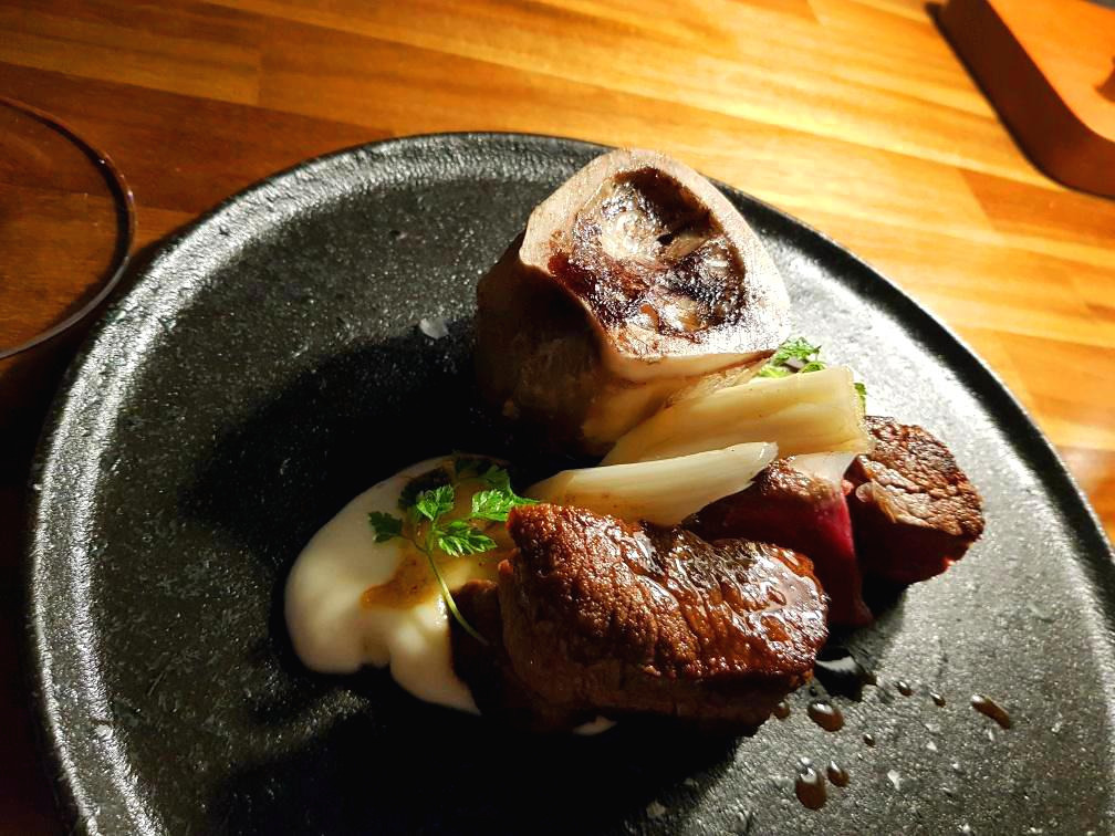 ** 본메로우 (bone marrow)’는 소의 골수라고 한다. 뼈 안에 있는 골수를 안심과 같이 곁들여 먹었다.
